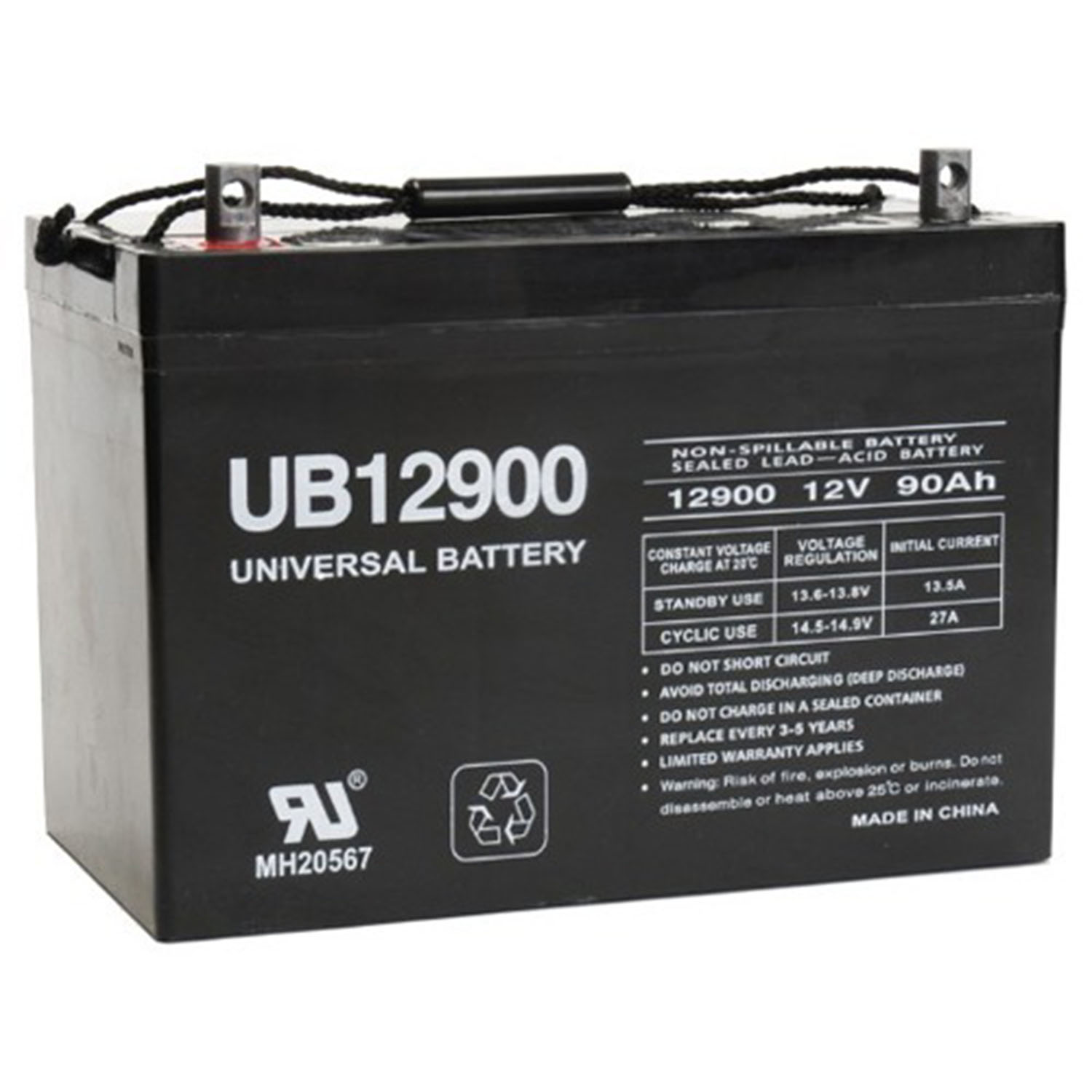 UB12900 12V 90AH - Absorbant Glass Mat (AGM) technology for superior performance. Valve regulated, spill proof construction allows safe operation in any position.