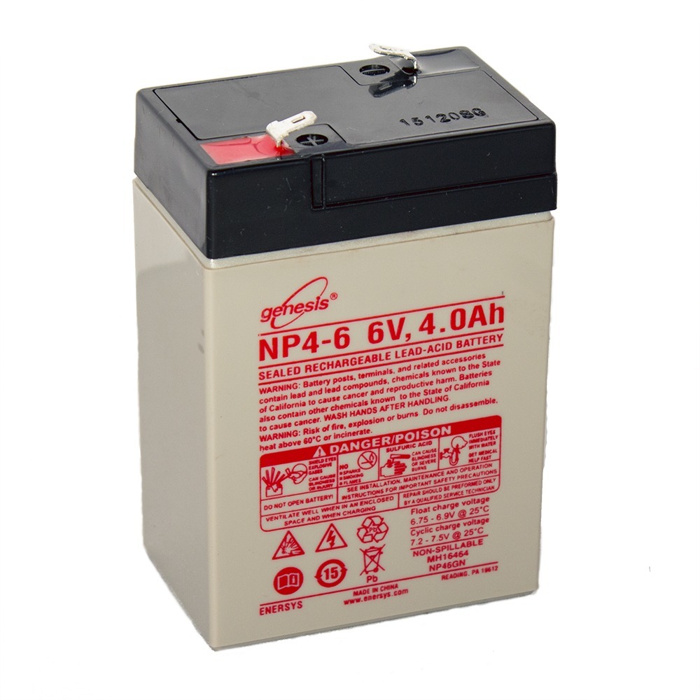 Genesis NP4-6 has been cross-referenced to be compatible and replace Sonnenschein DM2 sealed lead acid Battery. This 3 cell battery by Genesis is rated at 6V 4.0Ah 24 Whr. Enersys NP4-6 battery are designed using proven gas recombination technology which removes the need for regular water addition by controlling the evolution of hydrogen and oxygen during charging. Gas recombination provides the user with freedom to use lead acid batteries in a wide range of applications.