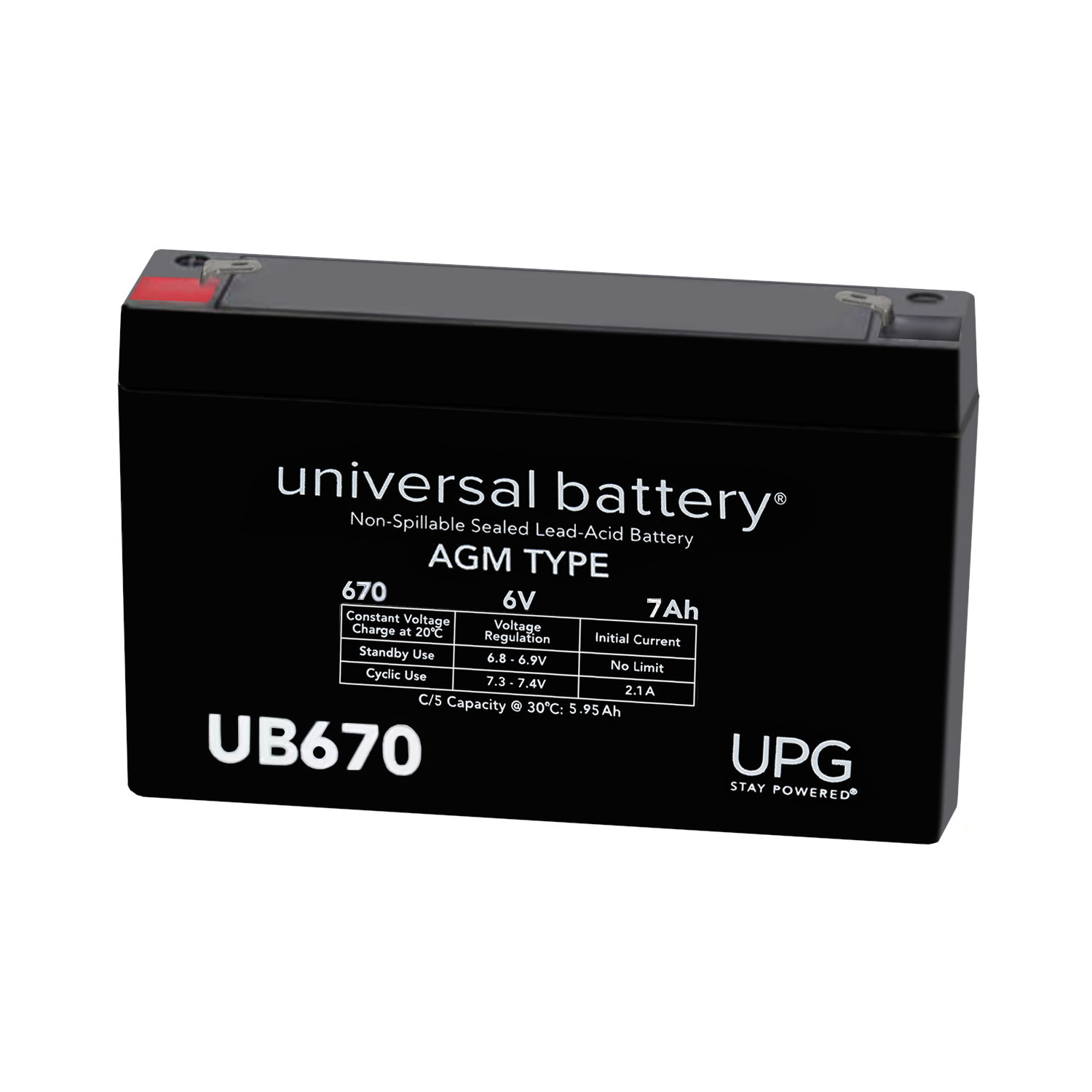 UB670 6V 7AH - Absorbant Glass Mat (AGM) technology for superior performance. Valve regulated, spill proof construction allows safe operation in any position.